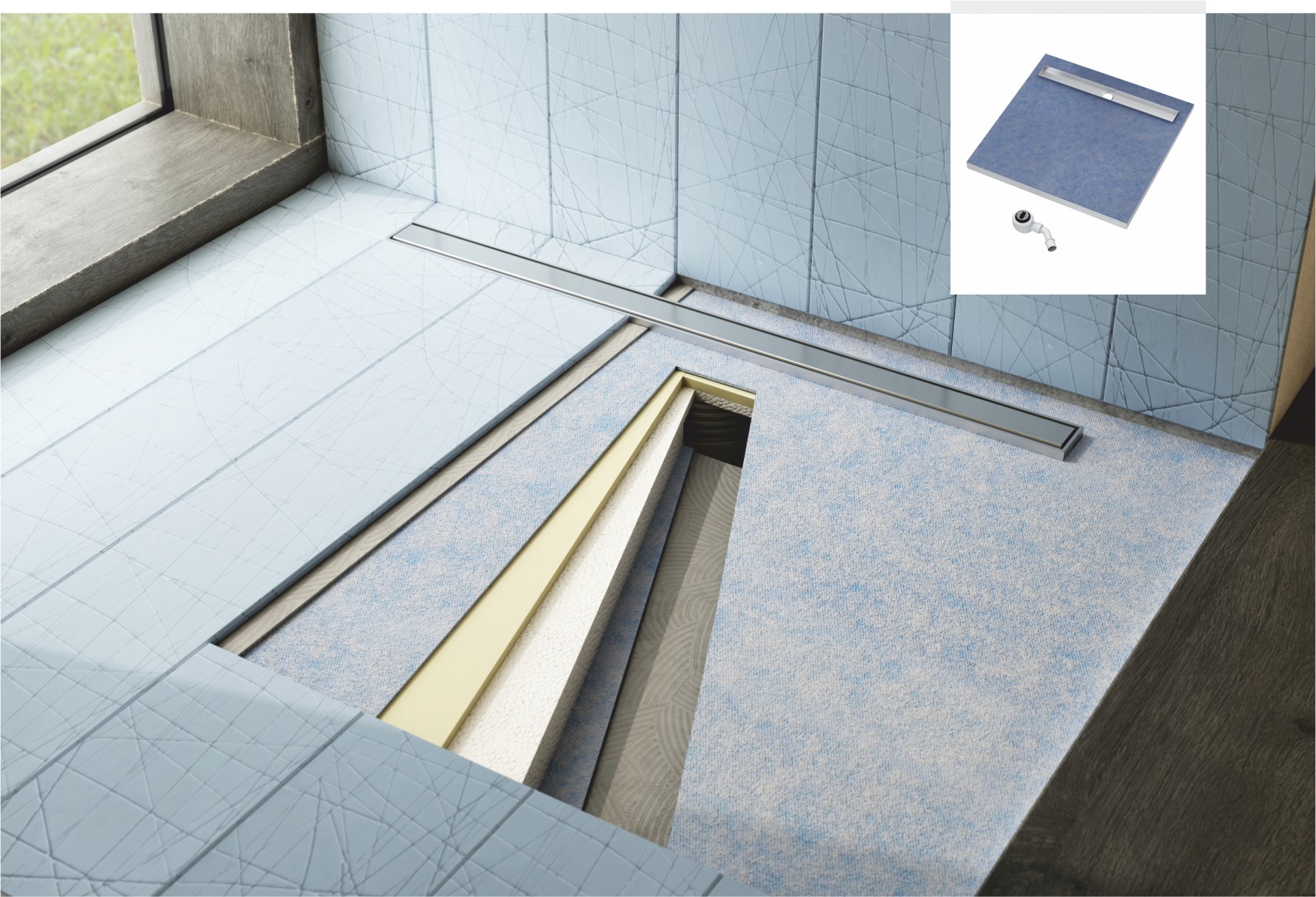 Idealnie wyprofilowane spady umożliwiają bezproblemowy odpływ wody. Fabrycznie uszczelniona rynna odpływowa zapewnia pełną odporność na korozję, a wielowarstwowe wzmocnienie zapewnia wysoką wytrzymałość na nacisk. Dodatkowo wypełnienie izolujące minimalizuje efekty akustyczne oraz zapobiega utracie ciepła. Mata uszczelniające zabezpiecza przed przedostaniem wilgoci oraz zapewnia znakomitą przyczepność kleju.