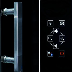 - Kabina wyposażona jest w dotykowy panel sterujący, wentylator, oświetlenie ledowe i halogenowe, półkę szklaną, radio, bluetooth