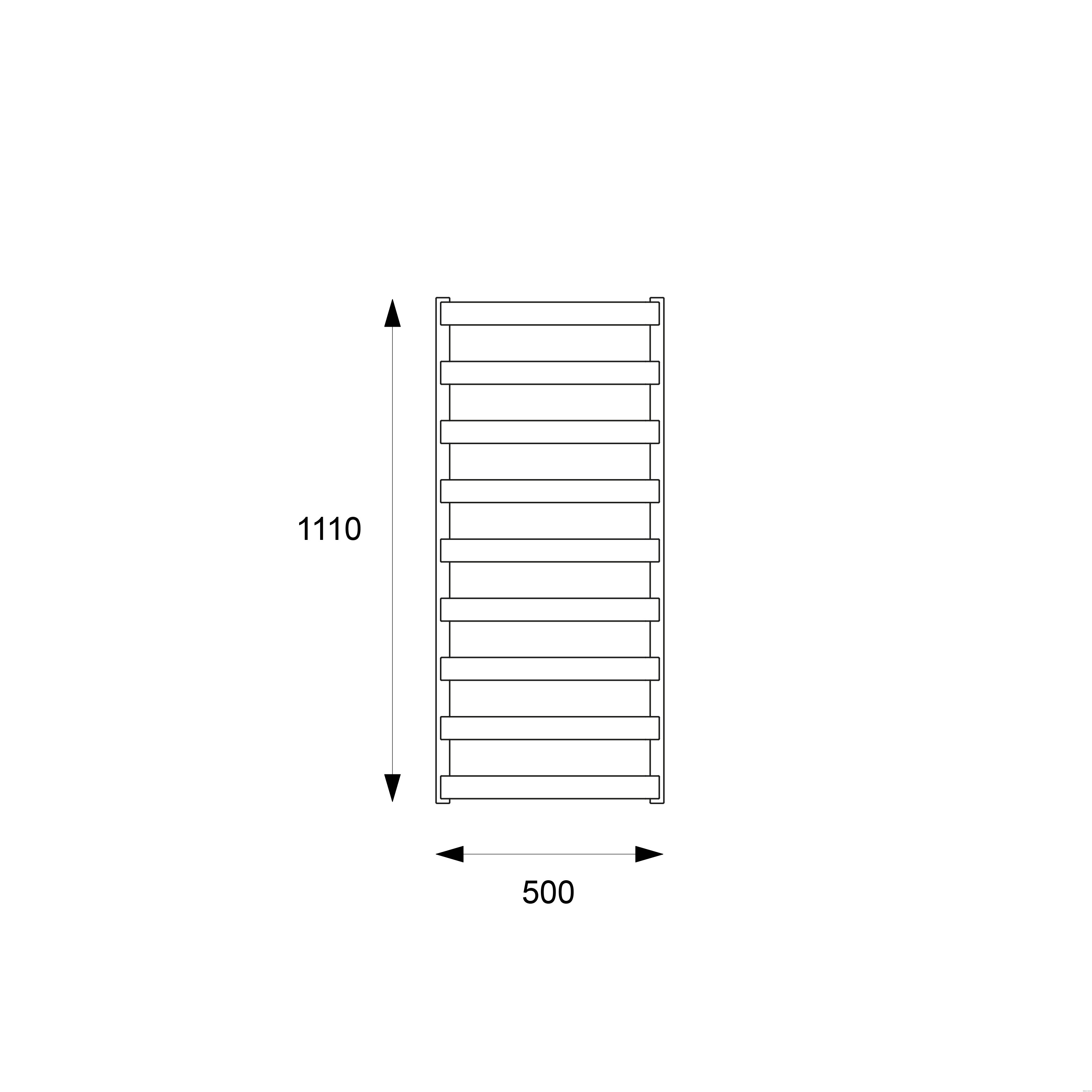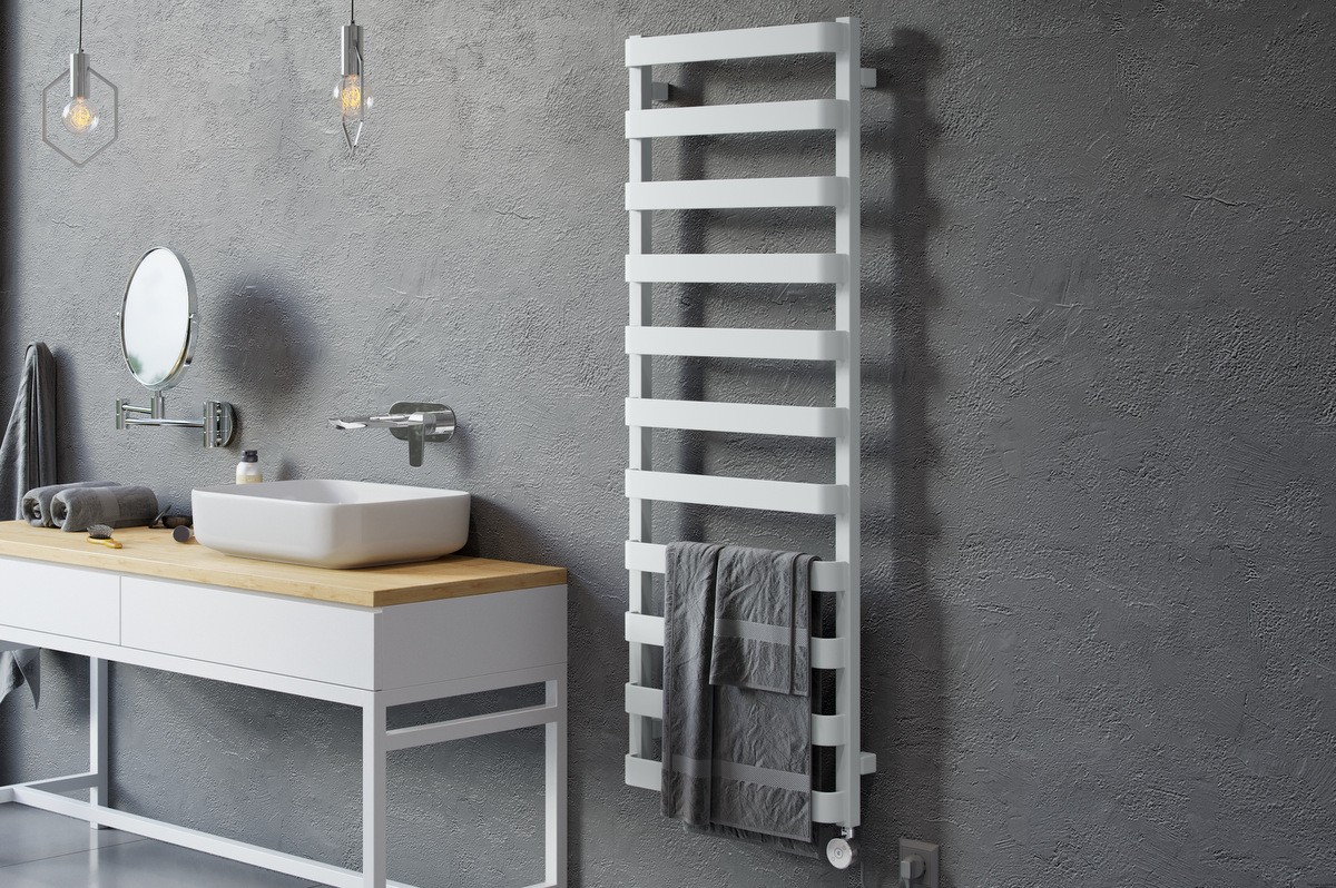 Grzejnik łazienkowy o prostym i regularnym układzie profili, łączący nowoczesną stylistykę z klasycznym ideałem piękna.