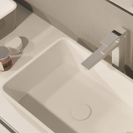 Umywalka została wykonana z materiału kompozytowego (M+), którego głównym składnikiem jest skała dolomitowa. Innowacyjna technologia produkcji gwarantuje perfekcyjne wykonanie każdego detalu, jednocześnie zapewniając wyjątkową trwałość i odporność.