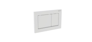 Biały przycisk do spłukiwania dwudzielnego w spłuczkach podtynkowych Geberit Omega, uruchamiany z przodu lub od góry z popychaczami izolowanymi akustycznie. Montaż bez użycia narzędzi.