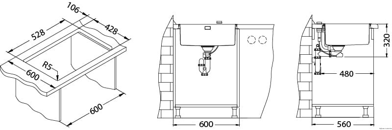 - Wymiary zlewozmywaka: 542 x 442 x 195 mm