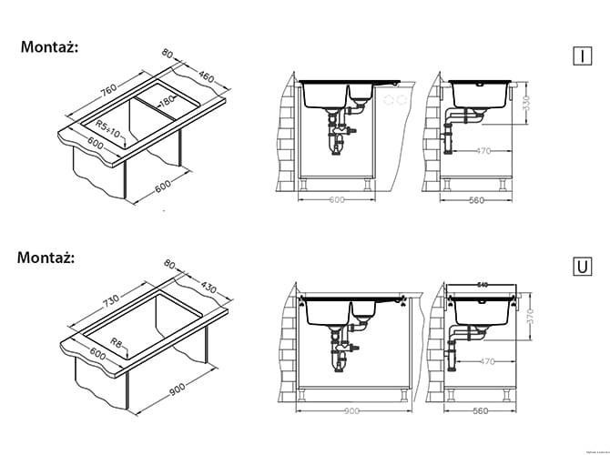 - Wymiary wycięcia w blacie: I 760x460 mm; U 730x600 mm