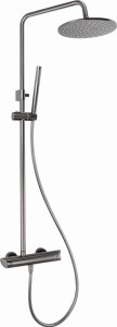 Deszczownica Arnika Titanium w efektownym, charakterystycznym dla tej kolekcji odcieniu ciemnej szarości, składa się ze ściennej baterii mieszaczowej z wygodnymi pokrętłami zamiast standardowej dźwigni, drążka o regulowanej wysokości, ustawionego asymetrycznie względem baterii, głowicy natryskowej oraz węża ze słuchawką prysznicową. Wąż o długości 1,5 m wyposażony został w system anty-twist zapobiegający jego skręcaniu, a słuchawka w system anti-calc ułatwiający utrzymanie jej w czystości. Dodatkowo użytkownik może dopasować ustawienie słuchawki do swoich potrzeb, dzięki możliwości regulacji wysokości i kąta nachylenia. Głowica natryskowa ma średnicę 25 cm, co gwarantuje przyjemną i komfortową kąpiel. Prezentowana deszczownia charakteryzuje się także szybką reakcją na włączanie i wyłączanie wody, dzięki czemu jest nie tylko ekologiczna, ale i ekonomiczna. Jej nowoczesny design oraz wyjątkowy kolor, nawiązujący do kolorów ziemi, spodobają się wszystkim miłośnikom minimalistycznych, skandynawskich i industrialnych wnętrz.
