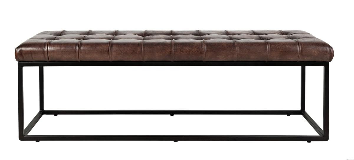 Ławka z pikowanym siedziskiem z naturalnej skóry w kolorze ciemnej sieny palonej oraz czarnym stelażem w stylu industrialnym.