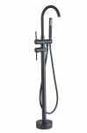 Nowoczesna i funkcjonalna bateria podłogowa w kolorze czarnym, zachwyca swoim niezwykłym designem. Idealnie wypełni przestrzeń łazienki. Produkt został wykonany z mosiądzu pokrytego potrójną warstwą czarnej matowej powłoki. Bateria jest bardzo trwała i łatwa w czyszczeniu.Baterie wannowe wolnostojące są nowoczesną i elegancką opcją umieszczania baterii w każdej łazience. Jest interesującą alternatywną dla baterii montowanych w ścianach i na rantach wanien. Doskonale sprawdzają się w łazienkach o większym metrażu, pełniąc nie tylko rolę czysto funkcjonalną, ale i ozdobną. W połączeniu z piękną wanną, dopasowaną designem do baterii, tworzą doskonały efekt wizualny. Ceramiczne głowice gwarantują długi okres użytkowania, słuchawka wyposażona w system Anti-Calc zapobiegający osadzaniu się kamienia.