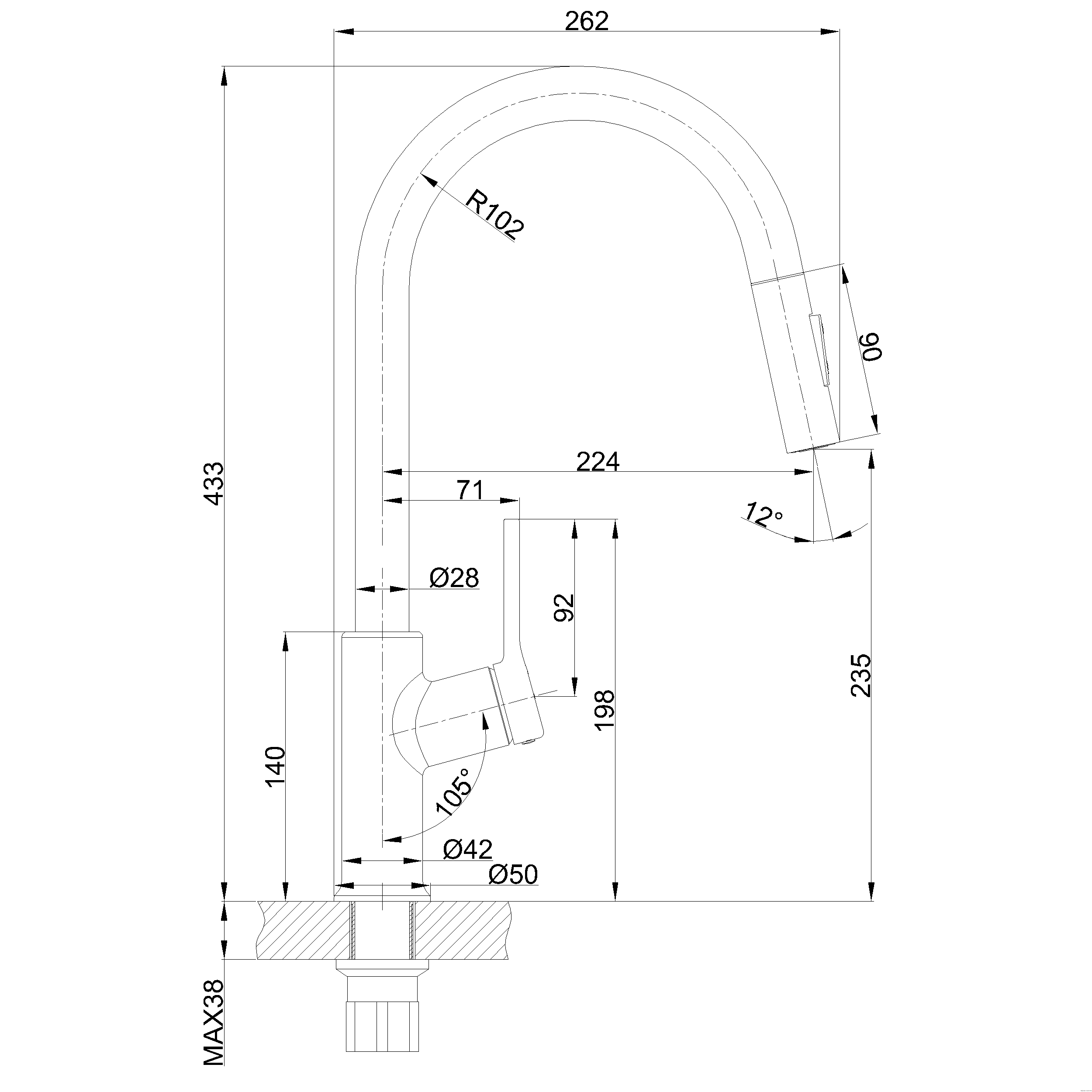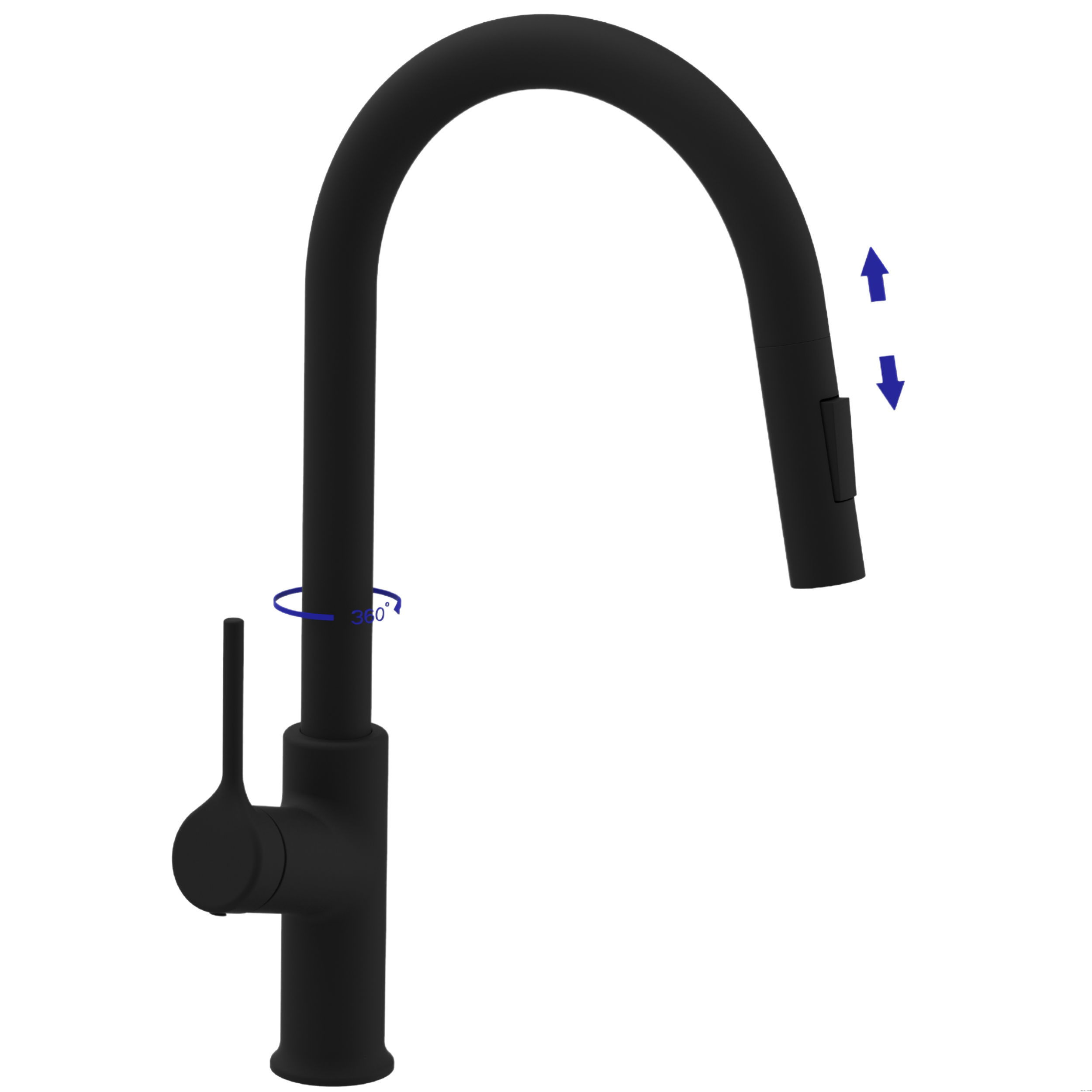 Jednouchwytowa, stojąca z obrotową, wyciąganą, dwufunkcyjną wylewką w kształcie U. (strumień normalny, spray). Mieszacz ceramiczny 35 mm. Perlator oszczędzający wodę, z tworzywa sztucznego.. W zestawie:. System szybkiego montażu. Kluczyk do mnotażu i demontażu perlatora. Wężyki przyłączeniowe 3/8”, 40 cm x 2 szt.