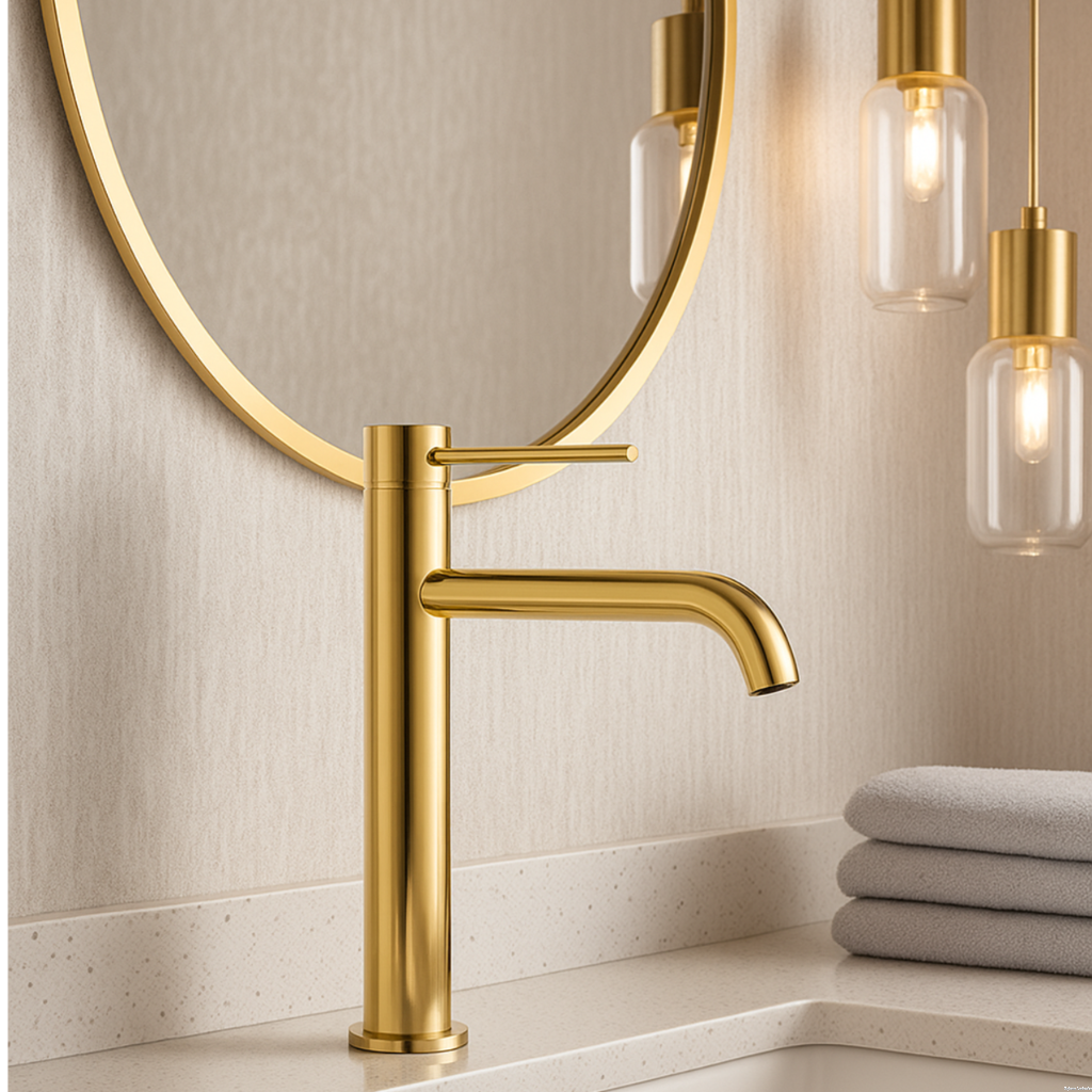 Elegancka bateria umywalkowa w połyskującym złotym wykończeniu. Wykonana ze stali nierdzewnej AISI 304, wyposażona w głowicę ceramiczną i napowietrzający perlator. Idealna do nowoczesnych aranżacji łazienkowych, łączy funkcjonalność z ekskluzywnym wyglądem.