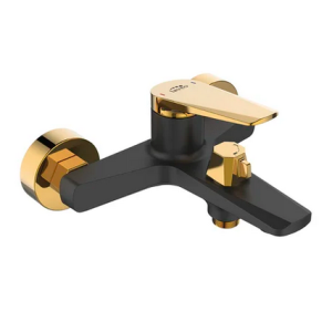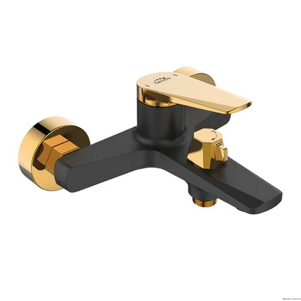 Ścienna bateria wannowa Rubio w wykończeniu czarno/złotym to model stworzony z myślą o eleganckich łazienkach. Połączenie dwóch najchętniej wybieranych przez architektów kolorów prezentuje się wyjątkowo stylowo. Subtelny charakter baterii podkreślony jest przez spłaszczony korpus i skośne zdobienia wzorowane na jubilerskie szlify. Bateria wyposażona jest w wygodny przełącznik funkcji, który odpowiada za przełączenie strumienia wody z wylewki na słuchawkę.