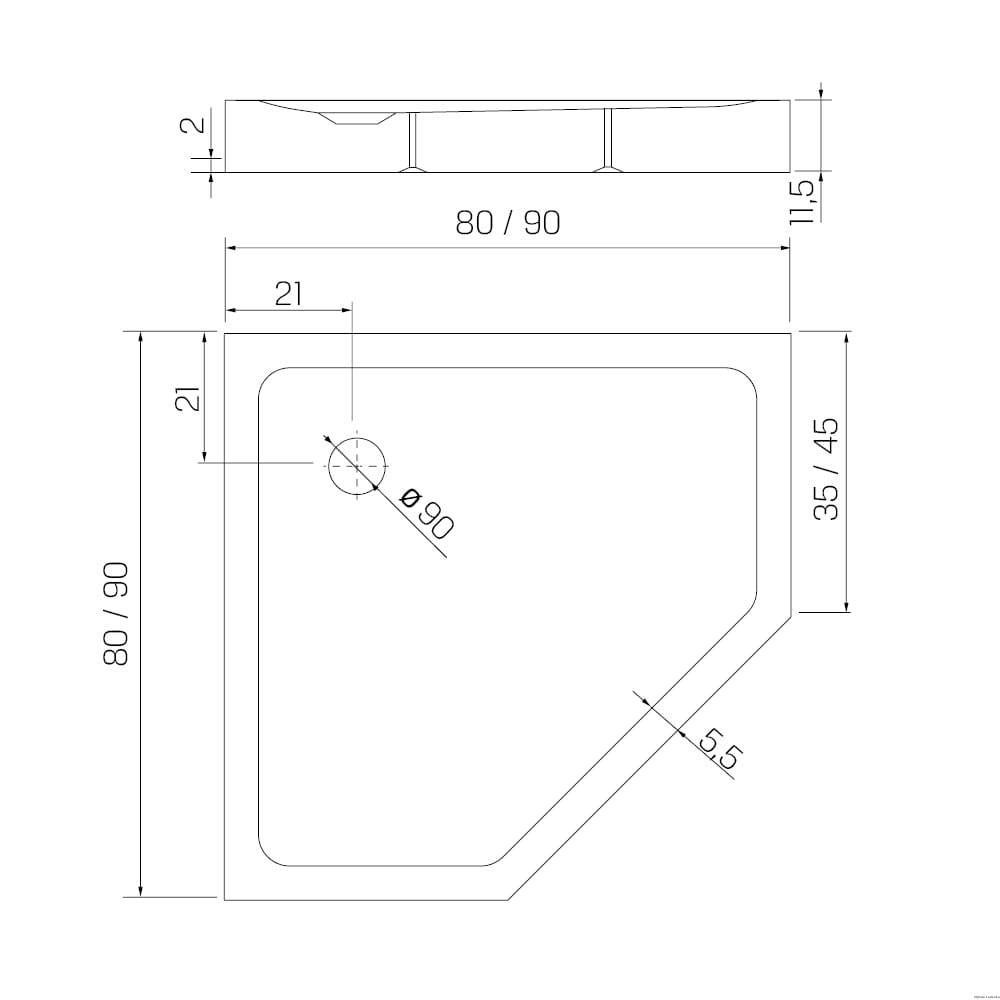 - umiejscowienie odpływu: w narożniku