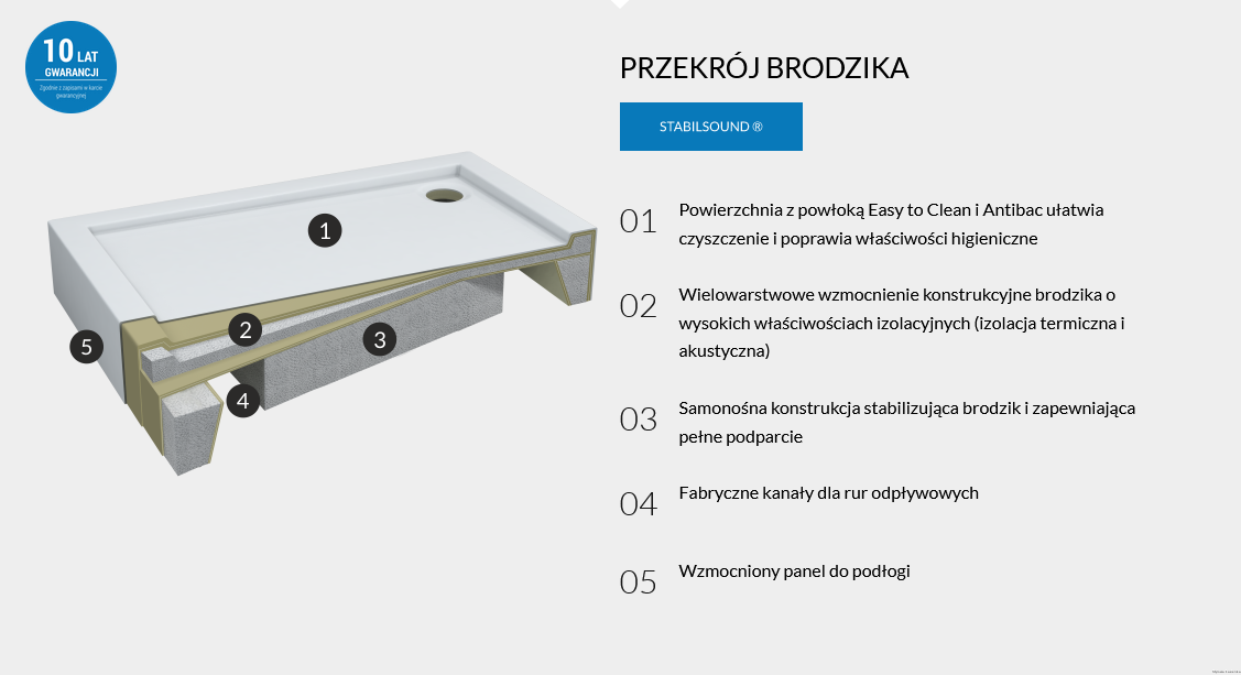 Materiał Stonicryl® i technologia Stabilsound Plus® gwarantują wytrzymałość i odporność brodzika na wszelkie uderzenia, upadki czy wysoki nacisk.