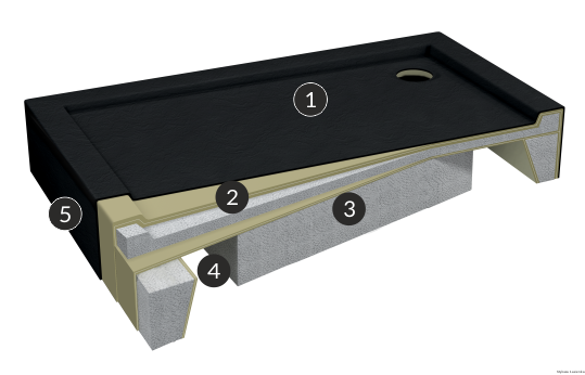 5. Wielowarstwowe wzmocnienia - Odportność na nacisk i zwiększona wytrzymałość także w newralgicznych rantach brodzika. Bok brodzika przychodowany do bezpośredniego oklejania płytkami lub zintegorowany panel boczny.