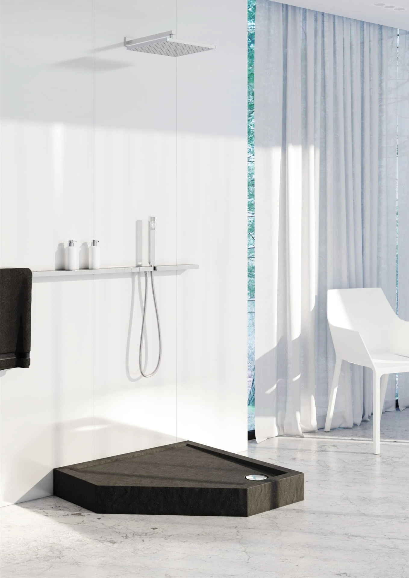 Brodzik akrylowy zintegrowany z nośnikiem Stabilsound Plus® oraz obudową akrylową przeciągniętą do podłogi Cameron Black Stone 90x90x12 cm, pięciokątny, produkcji Schedline, nr kat.: 3ST.C1PK-9090/C/ST