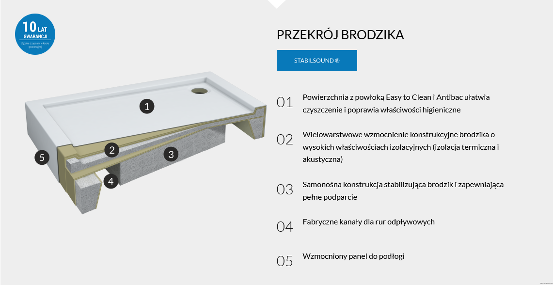Materiał Stonicryl® i technologia Stabilsound Plus® gwarantują wytrzymałość i odporność brodzika na wszelkie uderzenia, upadki czy wysoki nacisk.