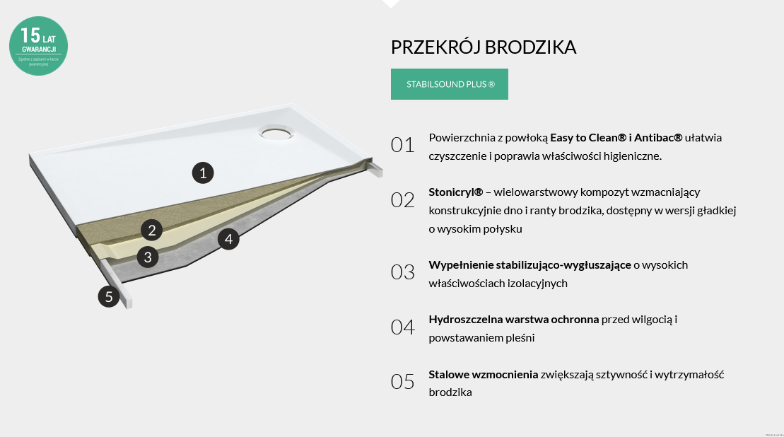 Materiał Stonicryl® i technologia Stabilsound Plus® gwarantują wytrzymałość i odporność brodzika na wszelkie uderzenia, upadki czy wysoki nacisk.