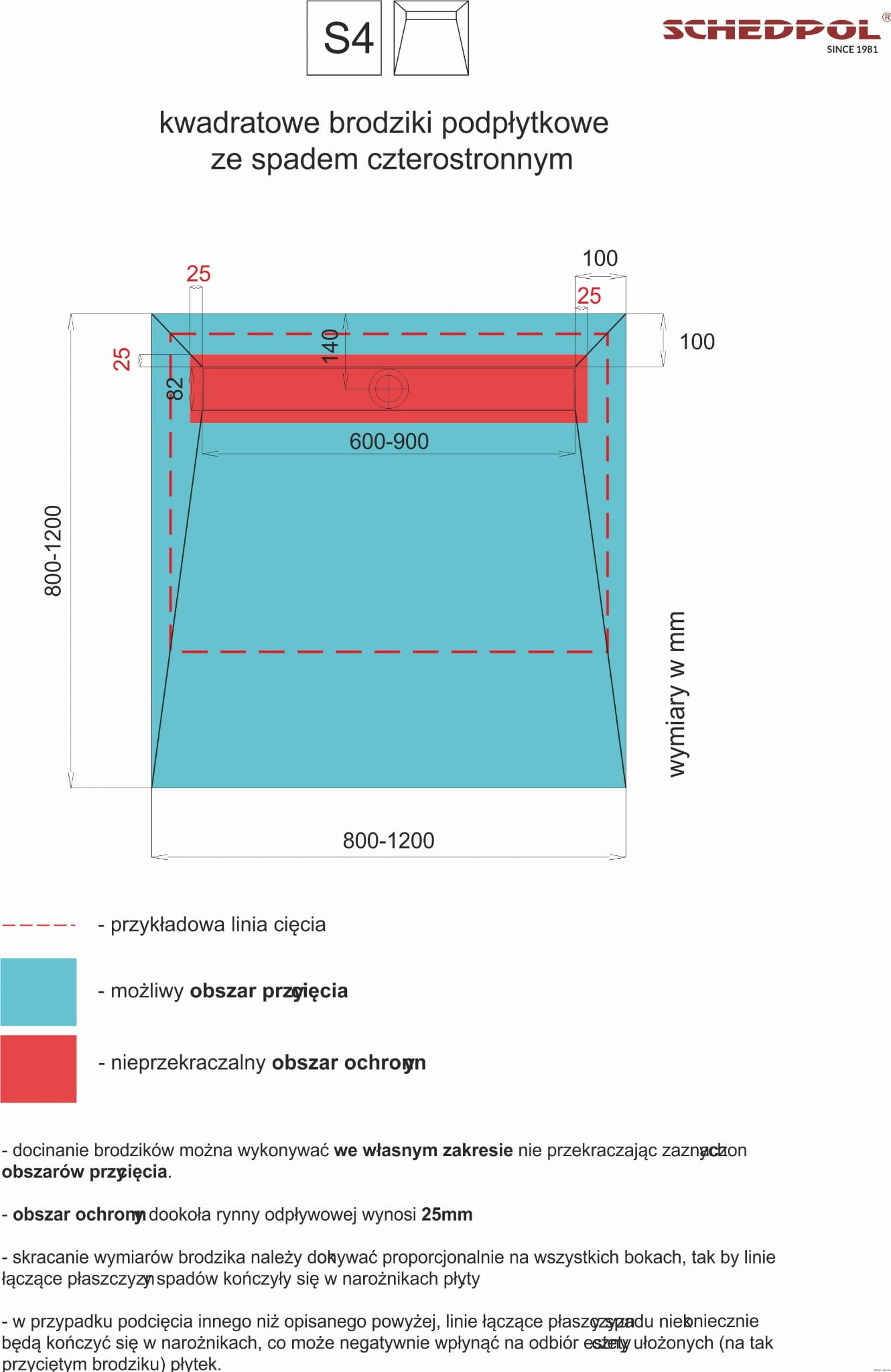 - Głębokość: montażowa 12,5cm Spad 4-stronny (2%)