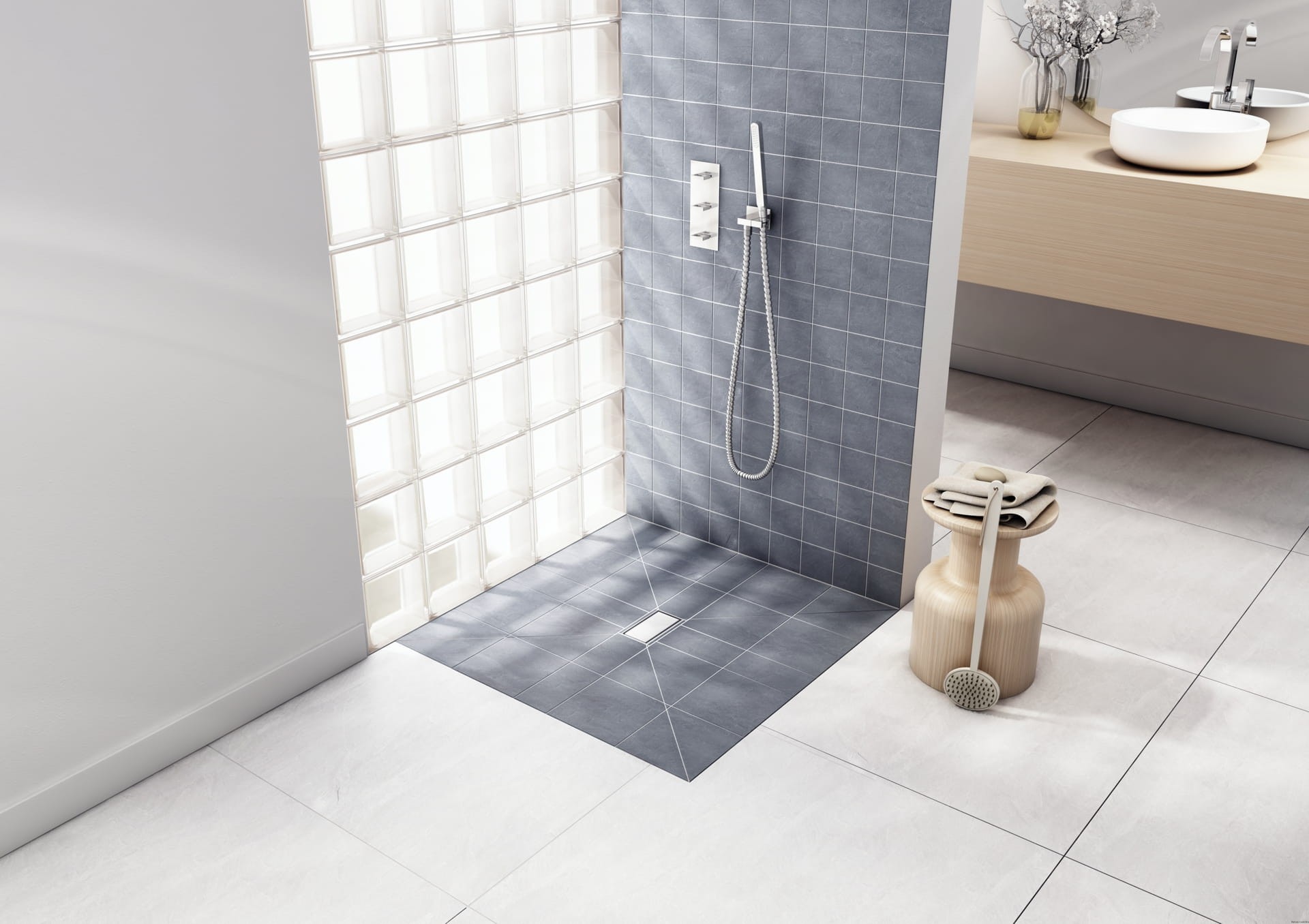 - Odpowiednie spady konstrukcyjne oraz fabryczne uszczelnienie całej powierzchni Gotowe spady konstrukcyjne eliminują konieczność wykonywania spadów z jastrychu cementowego (Długość schnięcia – co najmniej 21 dni), nie do pominięcia w przypadku montażu standardowego odpływu liniowego. Stosowane unikalne procesy technologiczne oraz hydroszczelna mata gwarantują zachowanie pełnej szczelności zestawu.