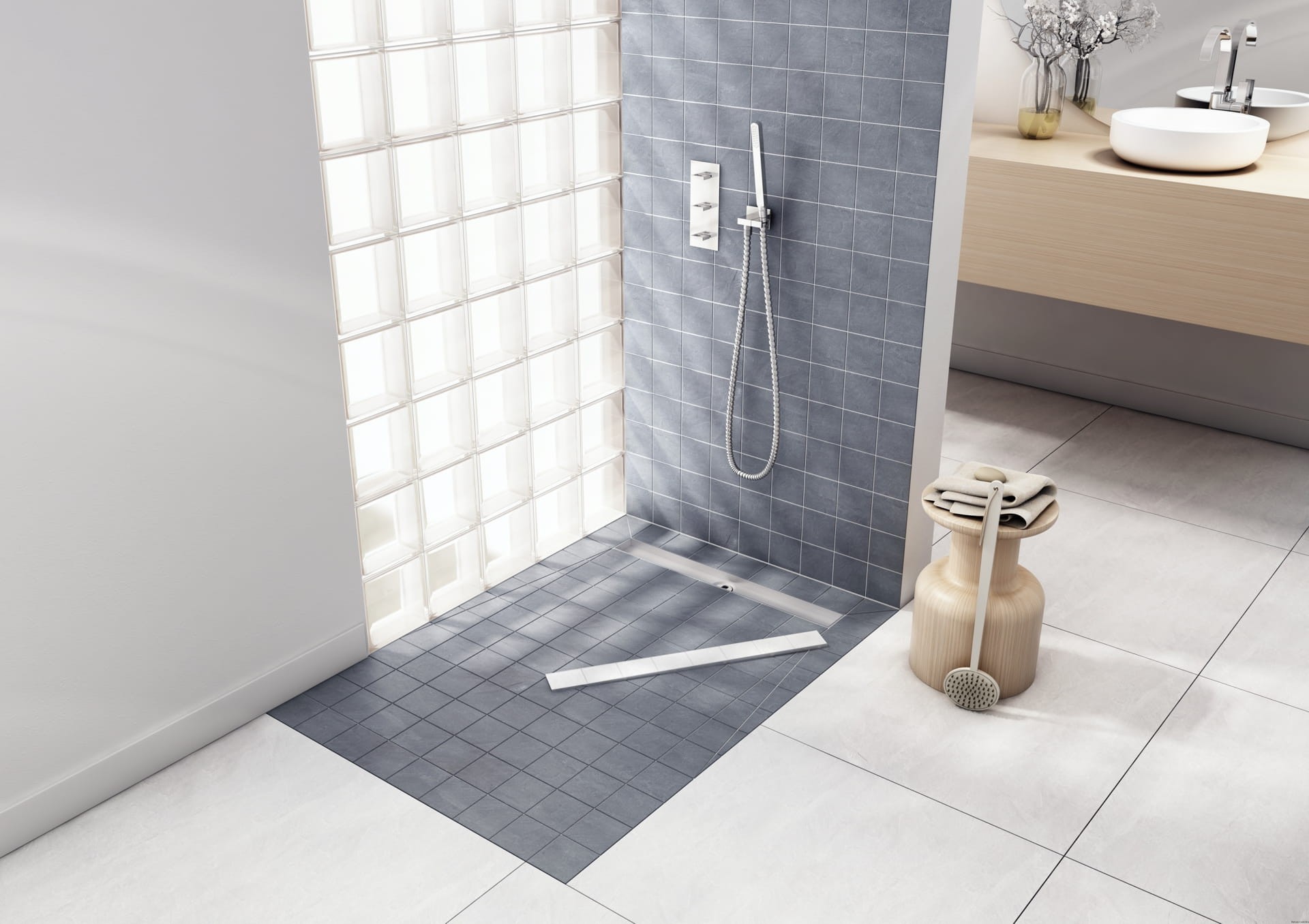 - Odpowiednie spady konstrukcyjne oraz fabryczne uszczelnienie całej powierzchni Gotowe spady konstrukcyjne eliminują konieczność wykonywania spadów z jastrychu cementowego (Długość schnięcia – co najmniej 21 dni), nie do pominięcia w przypadku montażu standardowego odpływu liniowego. Stosowane unikalne procesy technologiczne oraz hydroszczelna mata gwarantują zachowanie pełnej szczelności zestawu.