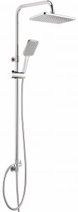 Deszczownica Tubo wykończona jest w błyszczącym chromie. Posiada regulowany rozstaw górnej jej części. Wyposażona w stalowy drążek, zapewnia stabilność i trwałość na lata użytkowania. Zarówno głowica natryskowa, jak i słuchawka prysznicowa są wyposażone w system Anti-calc, który zapobiega osadzaniu się kamienia, co znacznie ułatwia ich pielęgnację i wydłuża żywotność. Dodatkowo, deszczownica posiada wąż prysznicowy wykonany z wysokogatunkowej stali nierdzewnej, co gwarantuje jego odporność na uszkodzenia i korozję.