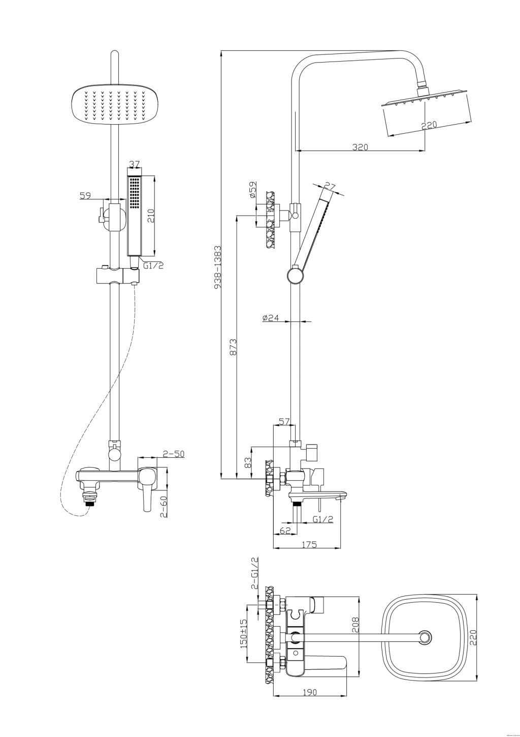 - Kolumna natryskowa o regulowanej wysokości, od 94 do 138 cm
