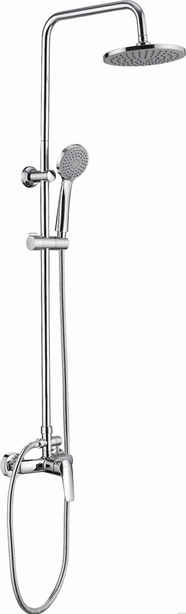 Deszczownica składa się z kilku kluczowych elementów, które wspólnie tworzą idealne warunki do relaksującego prysznica. Na stalowym drążku umieszczona jest słuchawka prysznicowa wraz z wężem. Słuchawka, jak i głowica natryskowa, posiadają innowacyjny system Anti-calc, który zapobiega osadzaniu się kamienia i ułatwia utrzymanie elementów w czystości. Mosiężna bateria jest solidna i trwała, zapewniając długotrwałe użytkowanie. Całość wykończona jest w eleganckim, błyszczącym chromie.