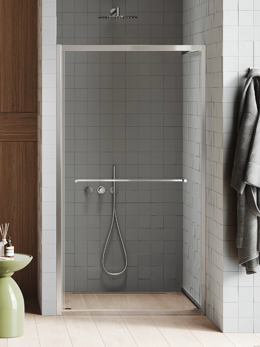 Nowy system otwierania drzwi linii New Varia zwiększa swobodę aranżacyjną łazienki. Możliwość otwierania drzwi na prawą lub lewą stronę pozwala lepiej wykorzystać przestrzeń wokół strefy prysznica. Rozwiązanie zapewnia szerokie, wygodne wejście i ułatwia dopasowanie kabiny do indywidualnego układu wnętrza.