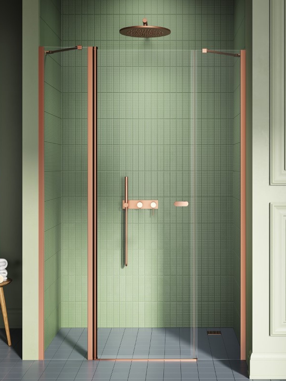 Model New Soleo Copper Brushed charakteryzuje się stylowymi, miedzianymi elementami o szczotkowanej powierzchni. Prysznicowe drzwi z ukośnym wspornikiem mają 6mm bezpieczne, hartowane szkło z ochronną powłoką Active Shield 2.0. Zawias kolumnowy umożliwia otwieranie drzwi zarówno na zewnątrz, jak i do wewnątrz. Produkt można zamontować z brodzikiem lub bez. Kolekcja jest objęta 3-letnią gwarancją, a dostępna jest również opcja zamówienia drzwi na wymiar.
