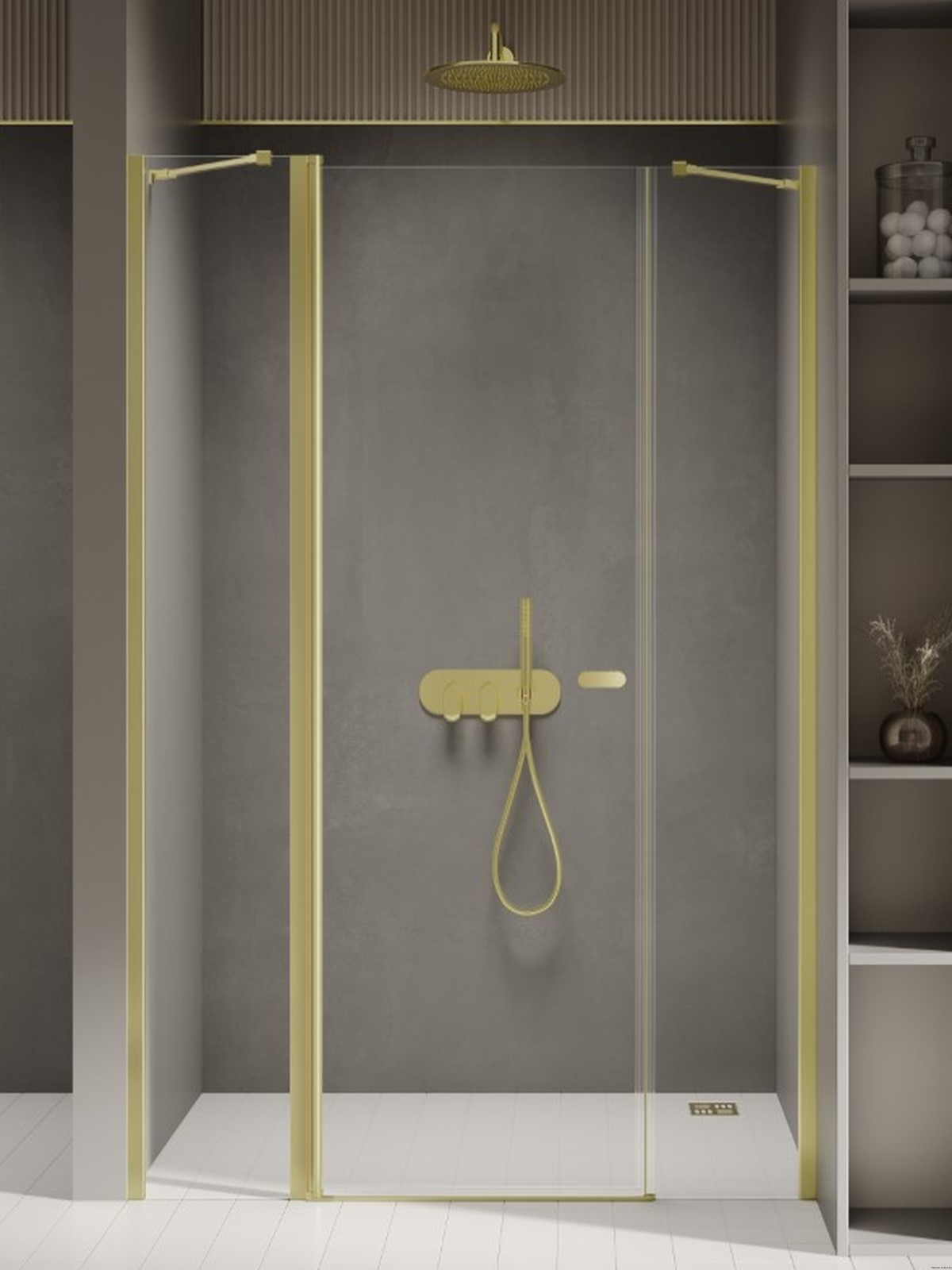 Model New Soleo Light Gold charakteryzuje się eleganckimi, złotymi elementami z subtelnym połyskiem. Drzwi prysznicowe są wsparte skośnym wspornikiem i wykonane z bezpiecznych, hartowanych szyb o grubości 6mm z powłoką ochronną Active Shield 2.0. Wyposażone w kolumnowe zawiasy, umożliwiające otwieranie drzwi zarówno na zewnątrz, jak i do wewnątrz. Produkt można zamontować z brodzikiem lub bez. Kolekcja objęta jest 3-letnią gwarancją. Istnieje również opcja zamówienia produktu na wymiar.