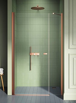 Model New Soleo Copper Brushed cechuje się eleganckimi, miedzianymi elementami o szczotkowanym wykończeniu. Drzwi prysznicowe ze skośnym wspornikiem zawierają bezpieczne, hartowane szyby o grubości 6mm, z powłoką ochronną Active Shield 2.0. Zawias kolumnowy umożliwia otwieranie drzwi na zewnątrz i do wewnątrz. Produkt można zainstalować z brodzikiem lub bez. Kolekcja oferuje 3-letnią gwarancję, a produkt dostępny jest również na wymiar.