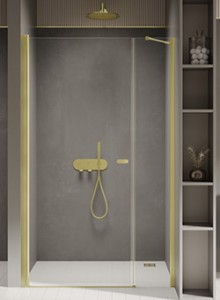 Model New Soleo Light Gold wyróżnia się eleganckimi, złotymi akcentami o subtelnym połysku. Drzwi prysznicowe z prostym wspornikiem mają bezpieczne, hartowane szyby o grubości 6 mm oraz powłokę ochronną Active Shield 2.0. Zawias kolumnowy umożliwia otwieranie drzwi na zewnątrz i do wewnątrz. Produkt można montować z brodzikiem lub bez niego. Kolekcja objęta jest 3-letnią gwarancją, a produkt można zamówić również w wersji na wymiar.