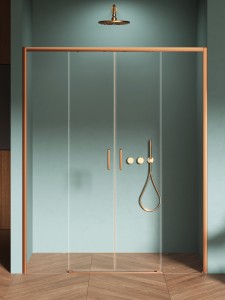 Model Prime Copper Brushed wyróżnia się eleganckimi detalami z miedzi o szczotkowanym wykończeniu. Posiada przesuwany system, który umożliwia płynne otwieranie drzwi, eliminując potrzebę montowania dolnej bieżni. Wyposażony jest w bezpieczne, hartowane szyby o grubości 6 mm z warstwą ochronną Active Shield 2.0. Drzwi wnękowe można montować zarówno z brodzikiem, jak i bez. System szybkiego montażu ułatwia połączenie bieżni drzwi z profilami przyściennymi. Model objęty jest 3-letnią gwarancją i dostępny także w wersji na wymiar.