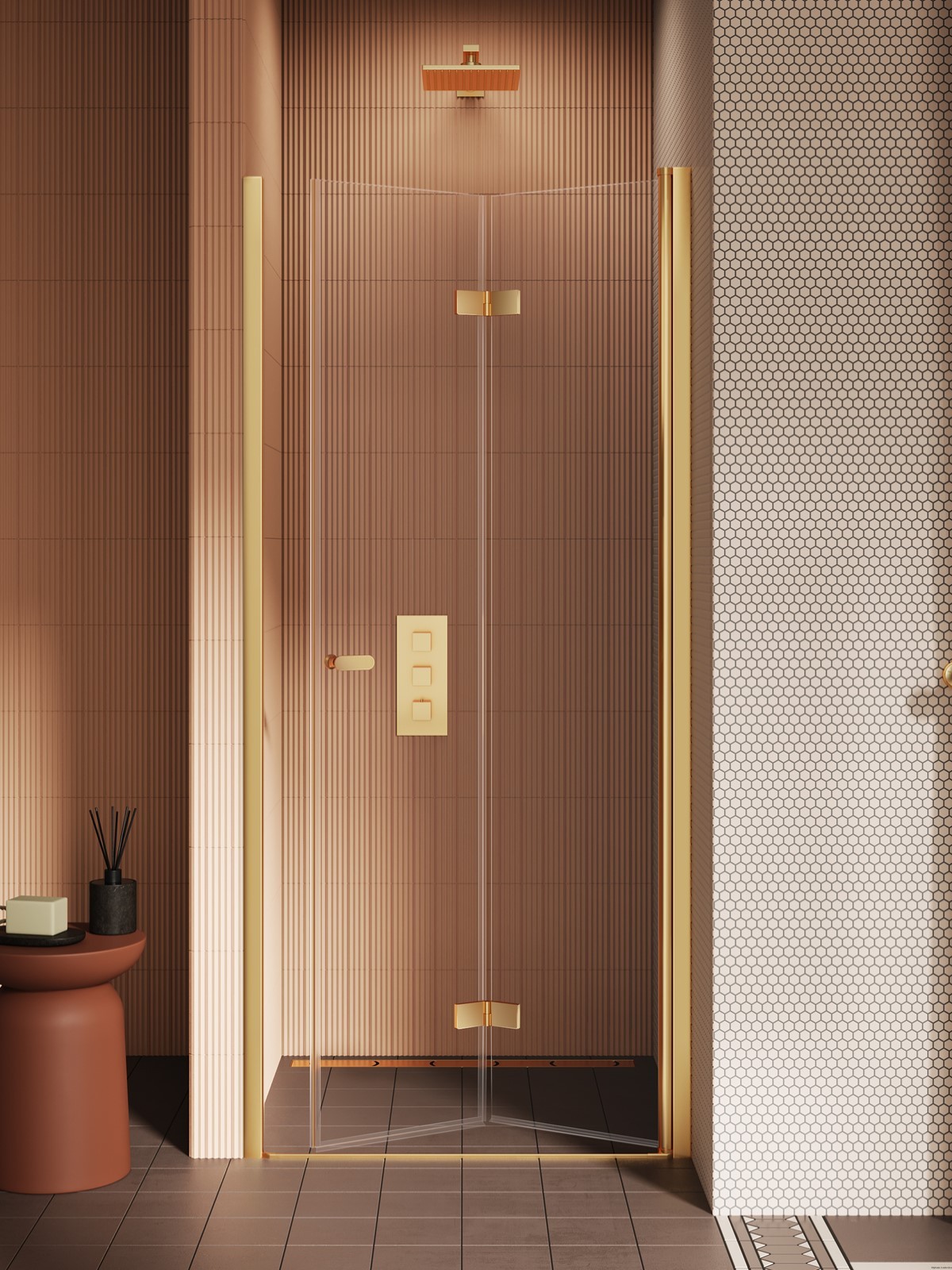 Model New Soleo Gold Brushed wyróżnia się eleganckimi złotymi detalami o szczotkowanej powierzchni. Drzwi prysznicowe z hartowanymi szybami o grubości 6 mm posiadają powłokę Active Shield 2.0. Dzięki kolumnowym zawiasom drzwi mogą otwierać się na zewnątrz i do środka. Produkt można zamontować z brodzikiem lub bez. Kolekcja obejmuje 3-letnią gwarancję, a także opcję zamówienia na wymiar.