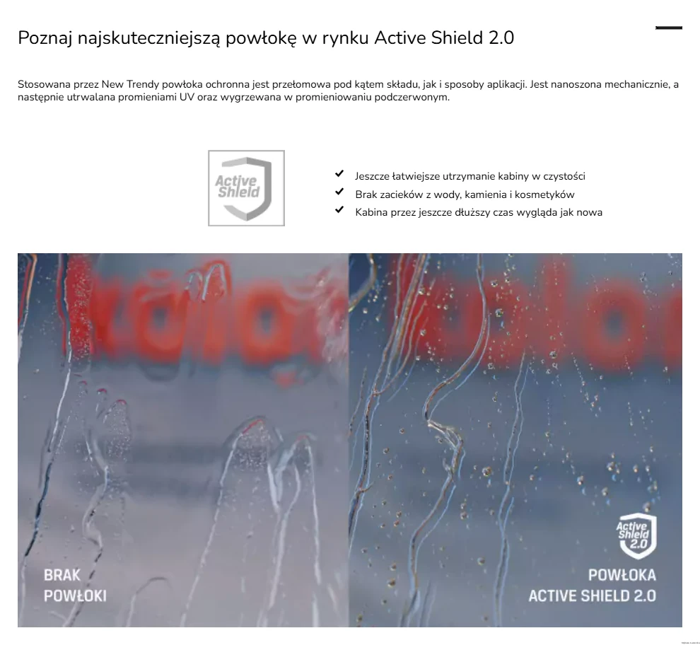 Powłoka Active Shield - nowoczesna powłoka chroniąca szkło przed zabrudzeniem i ułatwiająca utrzymanie kabiny w czystości. Jest to mikrocząsteczkowa warstwa ochronna, nanoszona na powierzchnię szkła. Wypełnia mikroskopijne nierówności na powierzchni szkła powodując, że staje się ono idealnie gładkie. Dzięki temu krople wody łatwiej spływają, nie osadzając się na jego powierzchni i nie pozostawiając śladów kamienia.