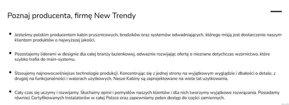 Firma New Trendy (kliknij i dowiedz się więcej o tej marce), to synonim nowoczesności i elegancji w świecie łazienek. Od 2006 roku, jako dynamicznie rozwijający się polski producent, zdobywa uznanie klientów zarówno w kraju, jak i na arenie międzynarodowej. Jej główna specjalizacja to kabiny prysznicowe, które uchodzą za symbol luksusu, komfortu i precyzji. Dzięki zastosowaniu najnowszych technologii i światowej klasy designu, New Trendy kreuje produkty, które przenoszą nas w przyszłość aranżacji łazienek.