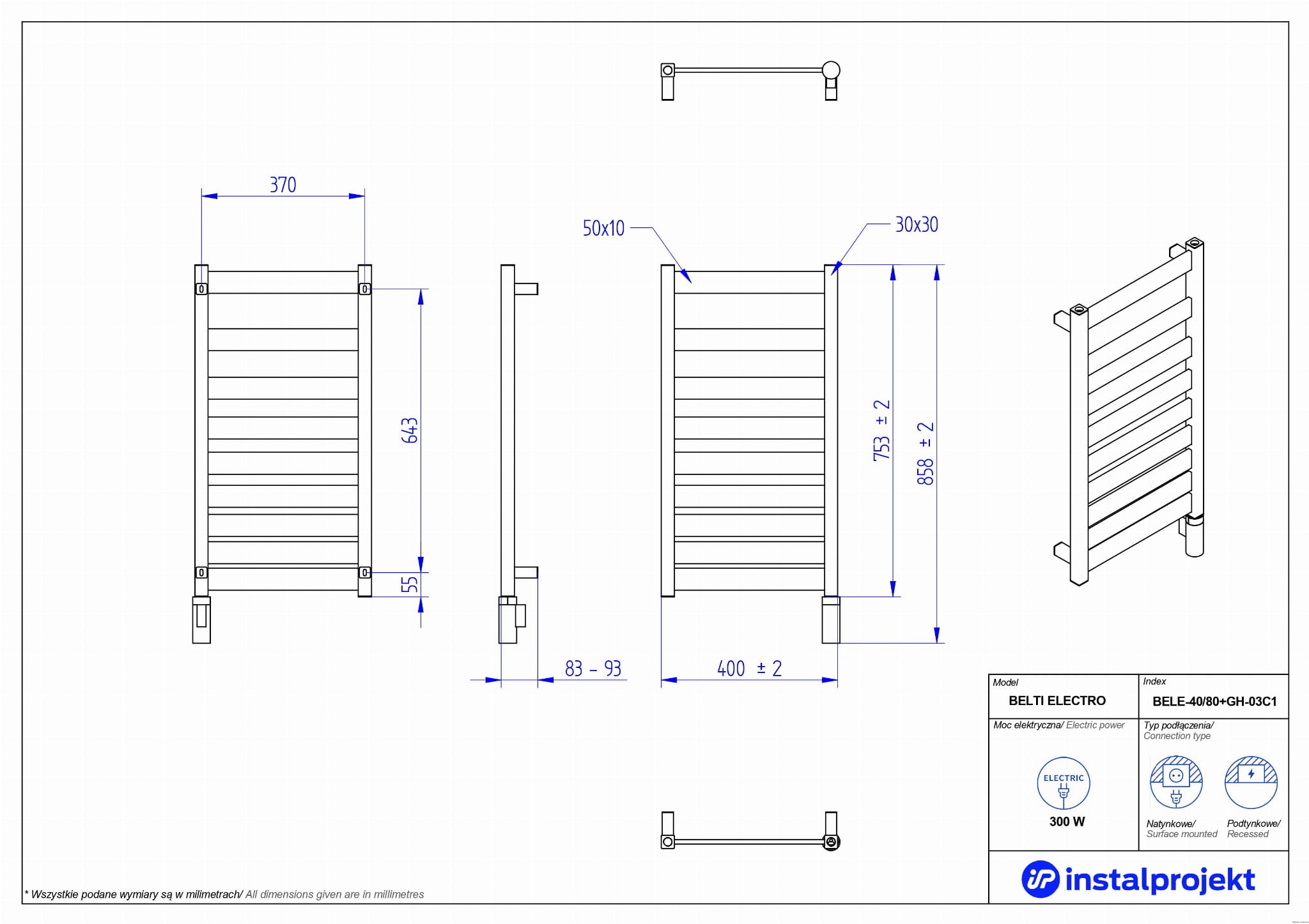 Producent Instal-ProjektGrzejnik elektryczny Instal Projekt Belti Electro czarny mat/black mat 40x80 cm BELE-40/80C31+GH-03C2