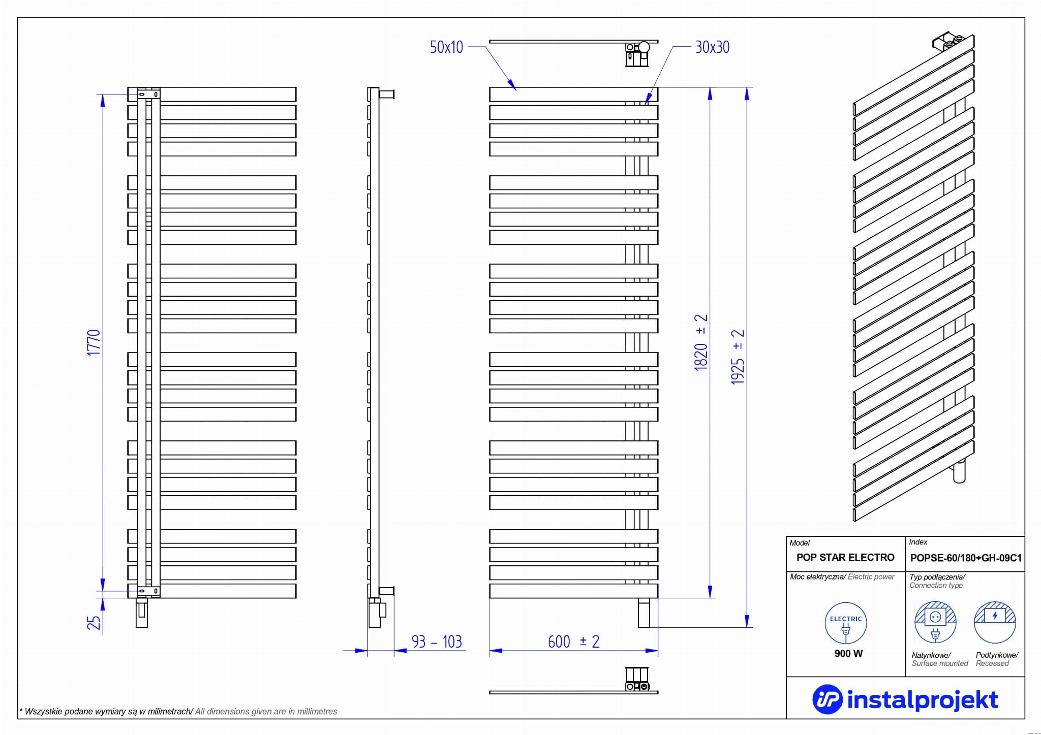 Producent Instal-ProjektGrzejnik elektryczny Instal Projekt Pop Star Electro biały połysk/white silk 60x180 cm POPSE-60/180+GH-09C1