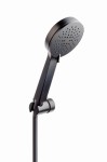 Dodatki w czerni takie jak armatura czy akcesoria znakomicie ożywiają monochromatyczne wnętrze. Świetnie wyglądają na tle pomalowanych na biało ścian czy jasnych łazienkowych płytek. W nowoczesnej strefie kąpieli barwę tę posiadają zestawy natryskowe, baterie, mydelniczki, półki na kosmetyki czy poręczne uchwyty. Minimalistyczny w formie zestaw natryskowy doskonały zarówno do kabiny prysznicowej, jak i wanny wyróżnia okrągła płaska, dobrze leżąca w dłoni rączka. 3 funkcje pozwalają na wybór strumienia zgodnie z potrzebami użytkownika. Jej ergonomiczny kształt oraz obrotowy uchwyt zapewniają komfort podczas kąpieli.