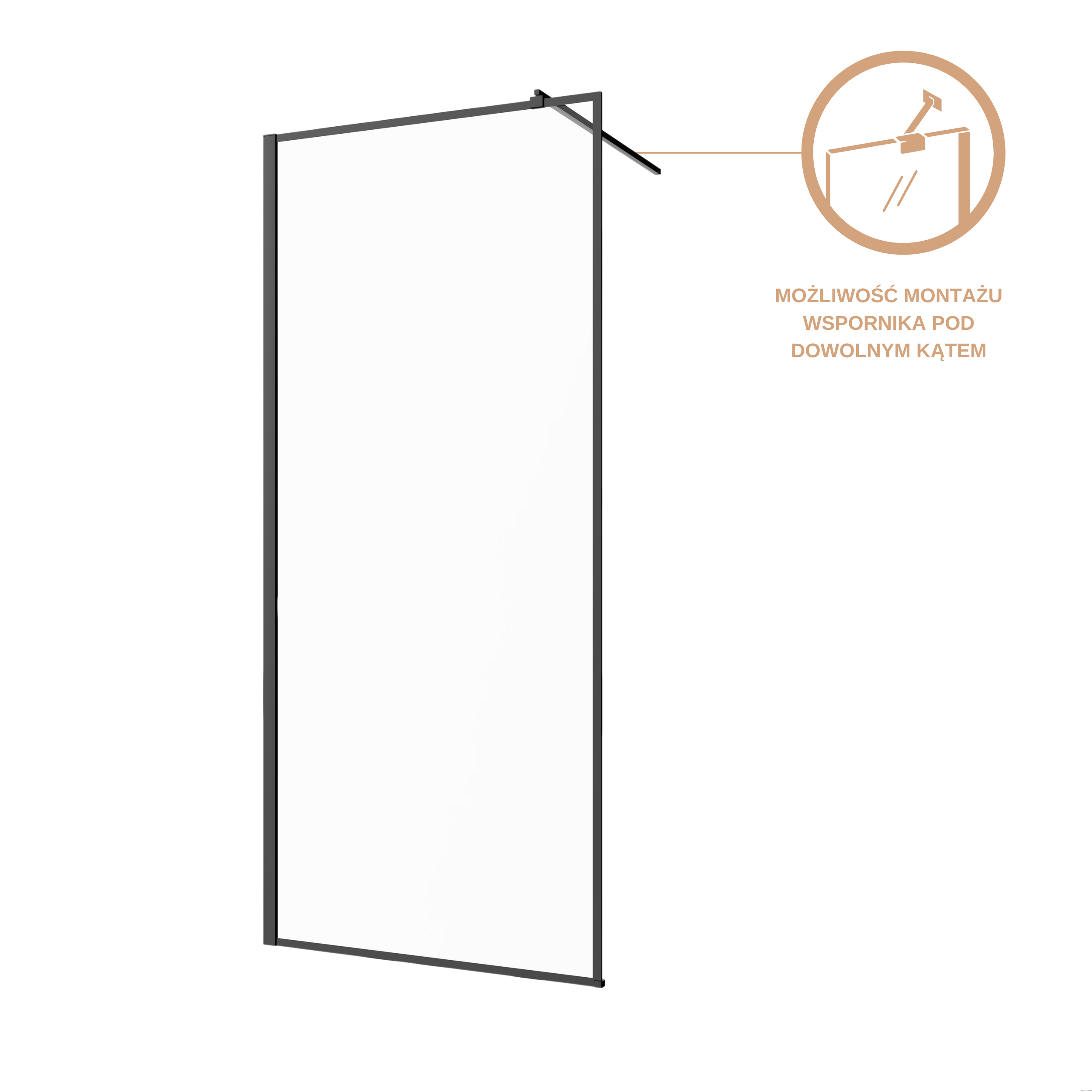 Kabina walk-in. szkło z ramką 8mm, powłoka shiny-glass, czarny.. Teleskop regulowany 70-120 cm (regulacja głębokości użytkowej kabiny) z możliwością montażu pod dowolnym kątem. Szkło hartowane grubość 8 mm z powłoką shinny-glass ułatwiającą czyszczenie. Struktura szkła: z ramką. Profil aluminiowy, jednoczęściowy z niwelacją nierówności ściany do 2 cm oraz systemem łatwego montażu. Wysokość kabiny: 200 cm. Kabinę można zamontować jako wersję prawą ilub lewą. Możliwość montażu na brodziku lub płytkach