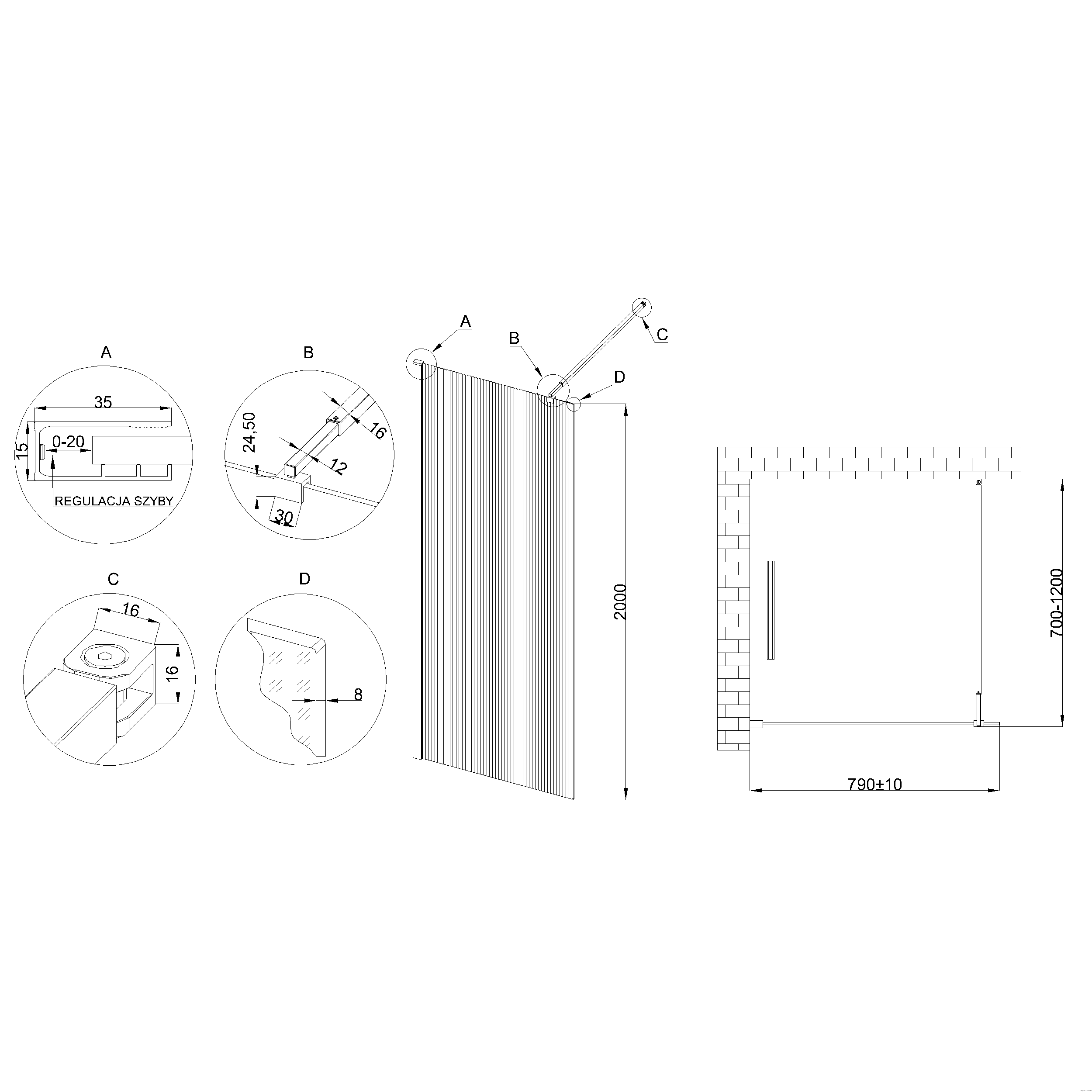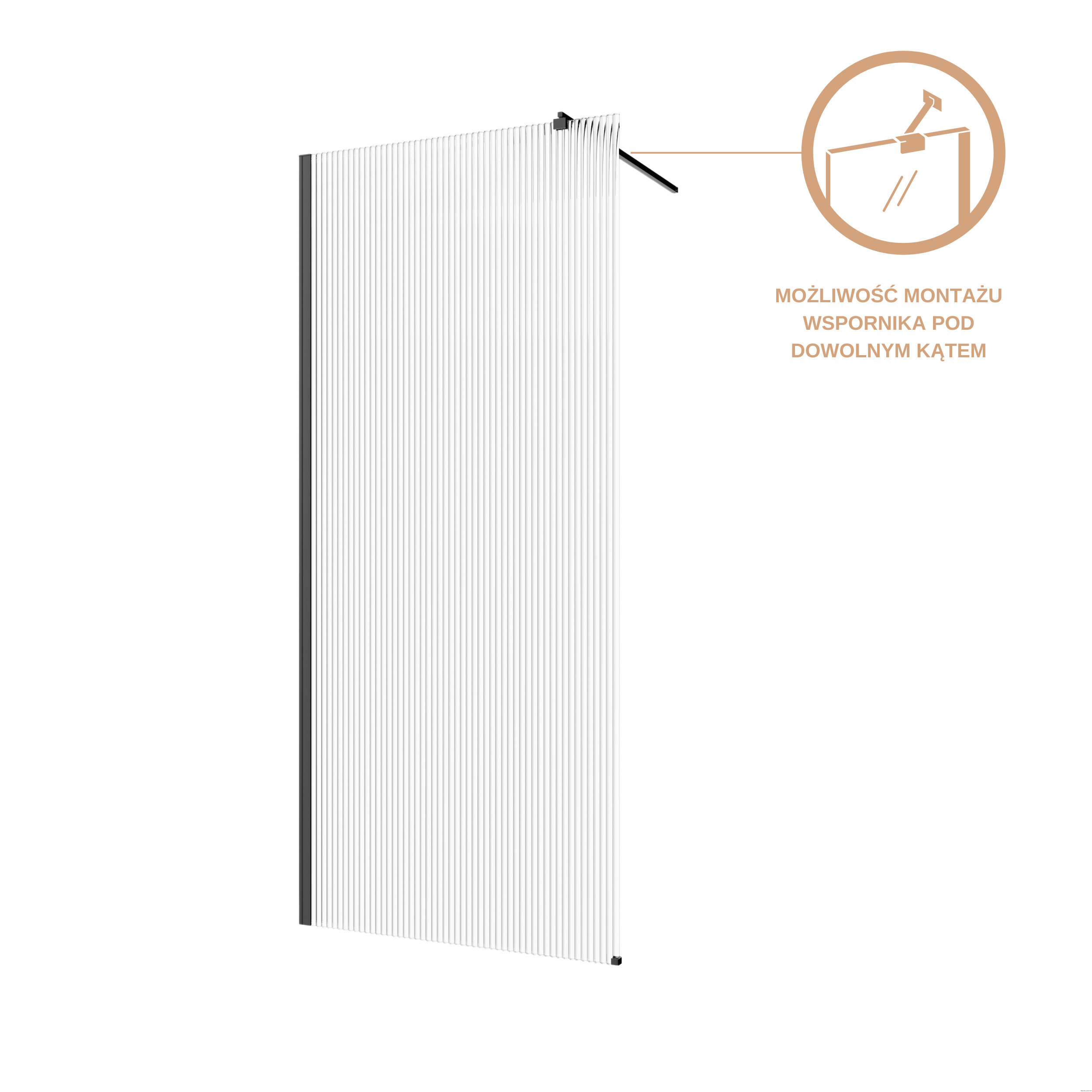 Kabina walk-in. szkło ryflowane 8mm, powłoka shiny-glass, czarny.. Teleskop regulowany 70-120 cm (regulacja głębokości użytkowej kabiny) z możliwością montażu pod dowolnym kątem. Szkło hartowane grubość 8 mm z powłoką shinny-glass ułatwiającą czyszczenie. Struktura szkła: ryflowane. Profil aluminiowy, jednoczęściowy z niwelacją nierówności ściany do 2 cm oraz systemem łatwego montażu. Wysokość kabiny: 200 cm. Kabinę można zamontować jako wersję prawą ilub lewą. Możliwość montażu na brodziku lub płytkach