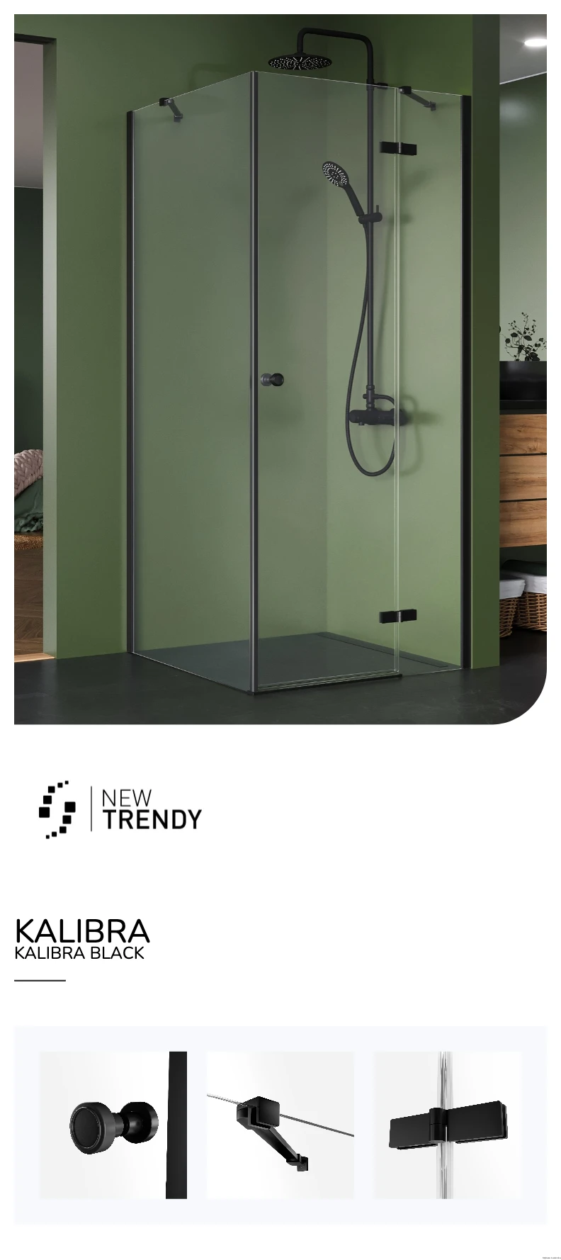 Kolekcja Kalibra Black to nowoczesne kabiny prysznicowe, które przyciągają wzrok eleganckimi, czarnymi akcentami w matowym wykończeniu. Zastosowane hartowane szkło o grubości 6 mm zostało zabezpieczone powłoką Active Shield, ograniczającą osadzanie się zanieczyszczeń i ułatwiającą utrzymanie czystości. Kabiny objęte są 2-letnią gwarancją i można je instalować zarówno z brodzikiem, jak i bez niego – w zależności od indywidualnych potrzeb aranżacyjnych.