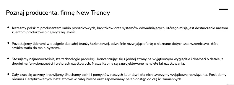 Firma New Trendy (kliknij i dowiedz się więcej o tej marce), to synonim nowoczesności i elegancji w świecie łazienek. Od 2006 roku, jako dynamicznie rozwijający się polski producent, zdobywa uznanie klientów zarówno w kraju, jak i na arenie międzynarodowej. Jej główna specjalizacja to kabiny prysznicowe, które uchodzą za symbol luksusu, komfortu i precyzji. Dzięki zastosowaniu najnowszych technologii i światowej klasy designu, New Trendy kreuje produkty, które przenoszą nas w przyszłość aranżacji łazienek.