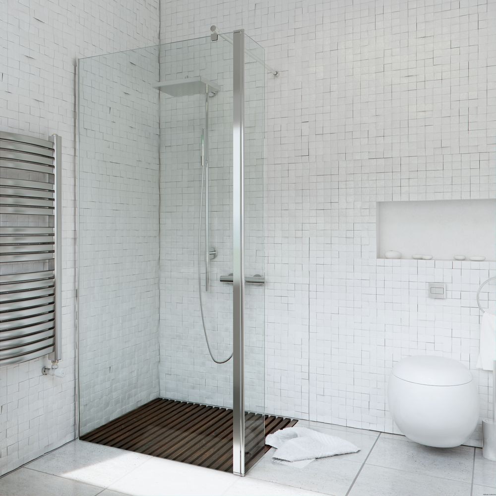 Kabina natryskowa typu walk in z boczną ścianką ruchomą. Dodatkowym atutem tej przestrzennej kabiny jest 8 mm szkło hartowane.