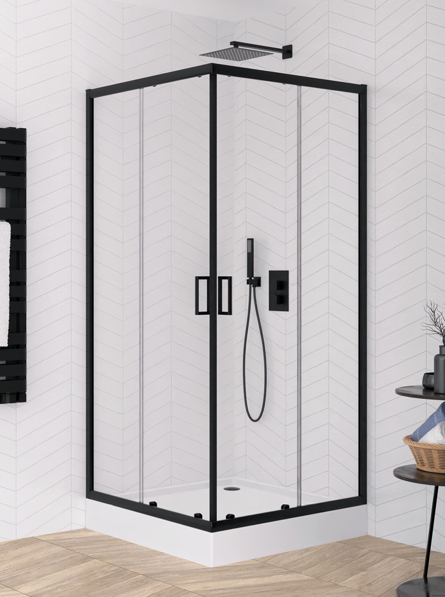 Kwadratowe kabiny prysznicowe z drzwiami przesuwnymi, dostępne w rozmiarach 80x80x185 cm oraz 90x90x185 cm, także w komplecie z brodzikiem.