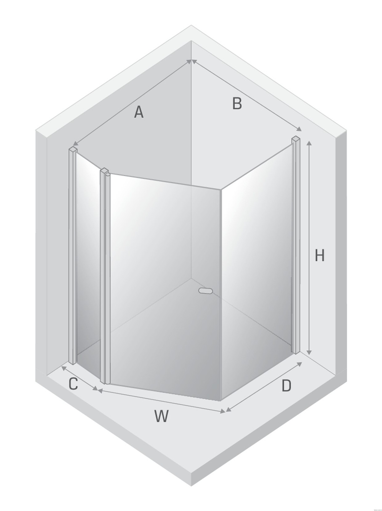 Pięciokątne kabiny prysznicowe, które można zamontować na dowolnej ścianie. Wyposażone w drzwi uchylne otwierające się w obu kierunkach. Wymiary to 100x80x195 cm.