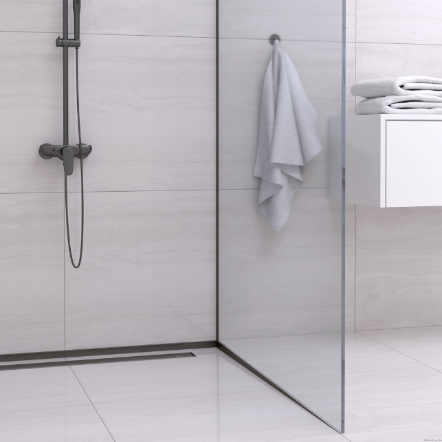 Lista spadkowa przyścienna wykonana jest ze stali nierdzewnej, co gwarantuje nie tylko estetyczny wygląd, ale również odporność na wilgoć oraz trwałość. Brak ostrych krawędzi zapewnia bezpieczeństwo użytkowania, a możliwość docięcia sprawia, że można ją łatwo dopasować do różnych wymiarów brodzika czy kabiny prysznicowej.