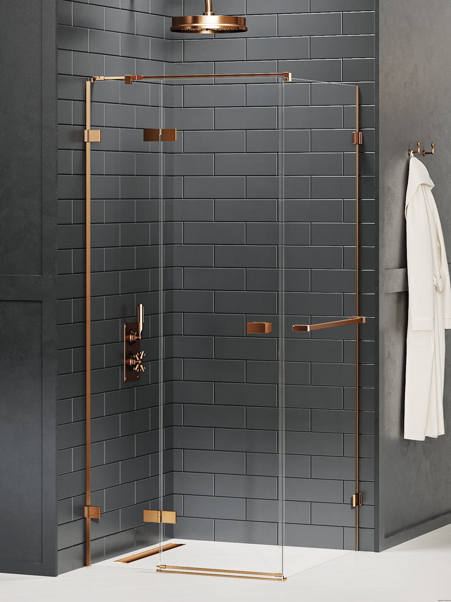 Model Avexa Copper Brushed posiada eleganckie detale w kolorze miedzi, o szczotkowanym wykończeniu. Kabina wyposażona jest w bezpieczne, hartowane szyby o grubości 6mm, z powłoką ochronną Active Shield. Model posiada zamontowany na ściance bocznej wieszak relingowy, doskonały do przechowywania ręcznika. W dolnej części drzwi znajduje się rynienka, odprowadzająca wodę z szyby do wewnątrz strefy prysznicowej. Kolekcja objęta 7-letnim okresem gwarancji. Kabina prysznicowa może być montowana zarówno z brodzikiem, jak i bez brodzika. Istnieje możliwość zamówienia produktu także w opcji na wymiar.