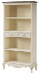 Regał w stylu prowansalskim z rzeźbieniami w kolorze kremowym i z przecieranym, jasnobrązowym wieńcem górnym. Produkt posiada metalowe uchwyty w kształcie muszelek i gięte nóżki.