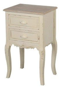 Szafka w stylu prowansalskim z rzeźbieniami w kolorze kremowym i z przecieranym, jasnobrązowym blatem. Produkt posiada metalowe uchwyty w kształcie muszelek i gięte nóżki.