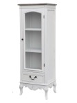 Witryna w stylu prowansalskim z rzeźbieniami w kolorze białym z przecieranym, ciemnobrązowym wieńcem górnym. Produkt posiada metalowe uchwyty i gięte nóżki.