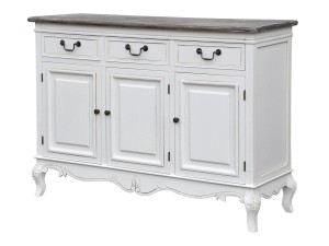 Komoda w stylu prowansalskim z rzeźbieniami w kolorze białym z przecieranym, ciemnobrązowym blatem. Produkt posiada metalowe uchwyty i gięte nóżki.
